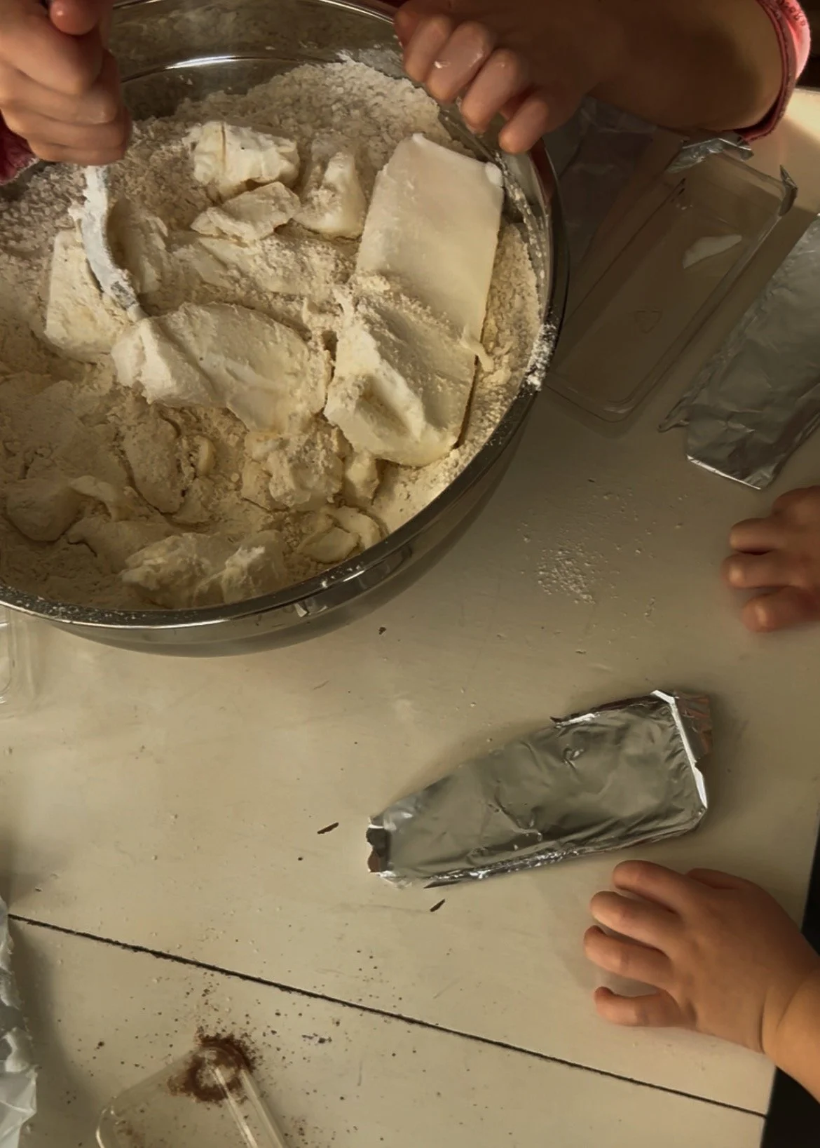 We typically start cutting it in with a fork but quickly move to mixing with our hands.